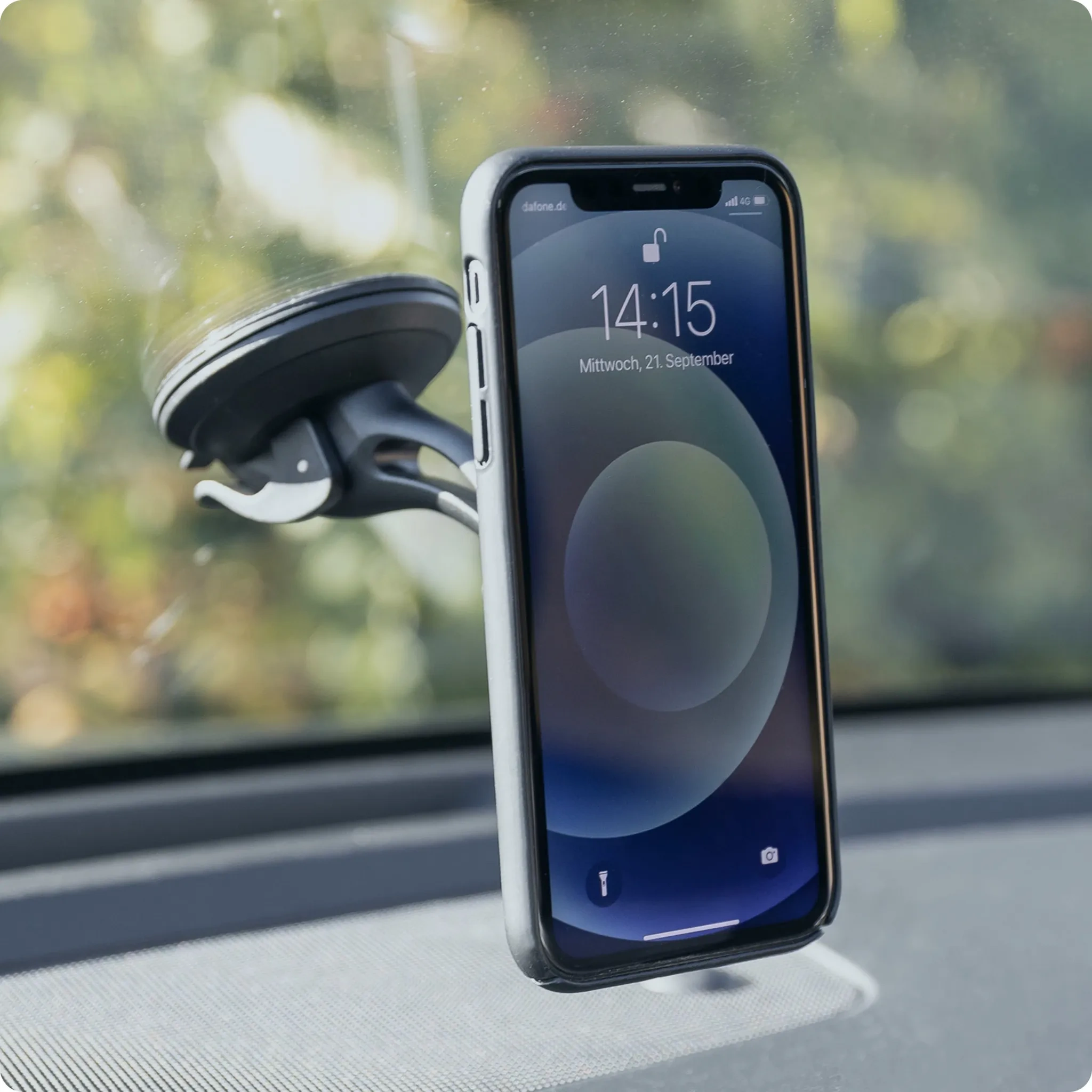 Universelle Magnethalterung • Zur Befestigung an Windschutzscheibe oder Armaturenbrett • Werkzeugfreie Montage • Stabiler Halt auch auf unebenen Straßen