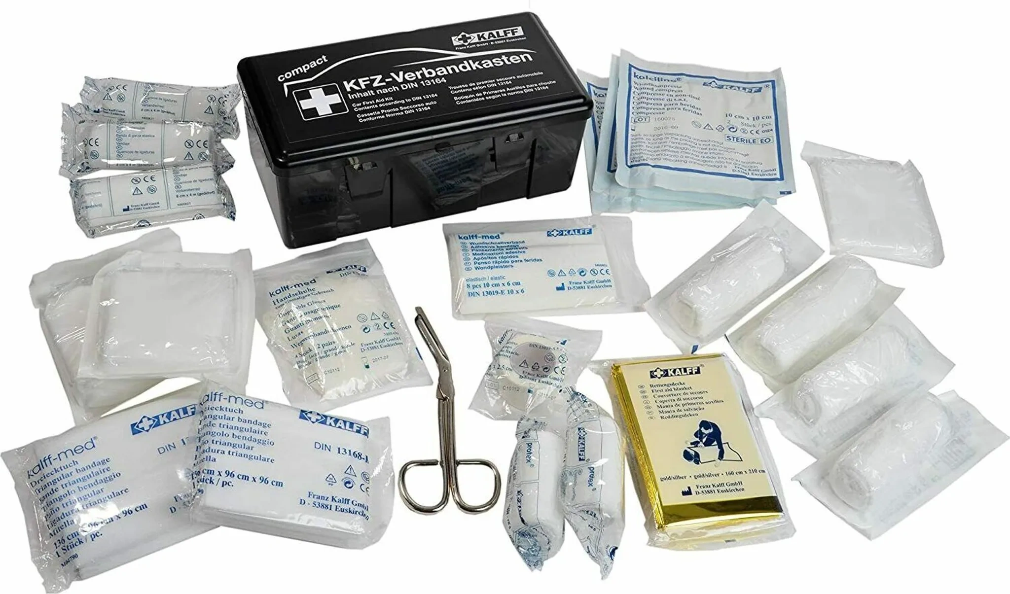 Im Paket | 1 × KALFF „Kompakt“ Kfz-Verbandkasten, schwarz, mit vollständigem DIN-13164-Inhalt |
