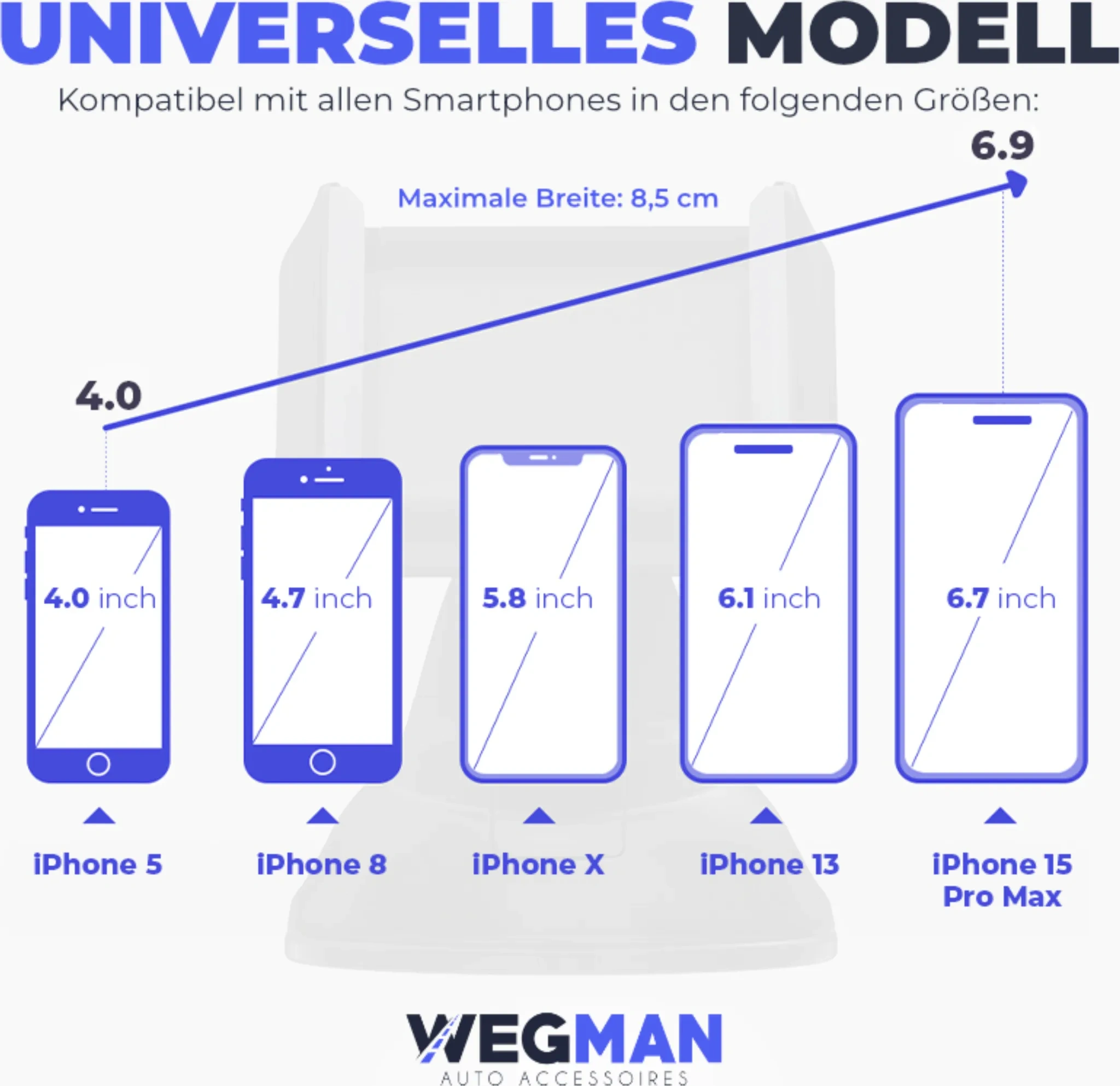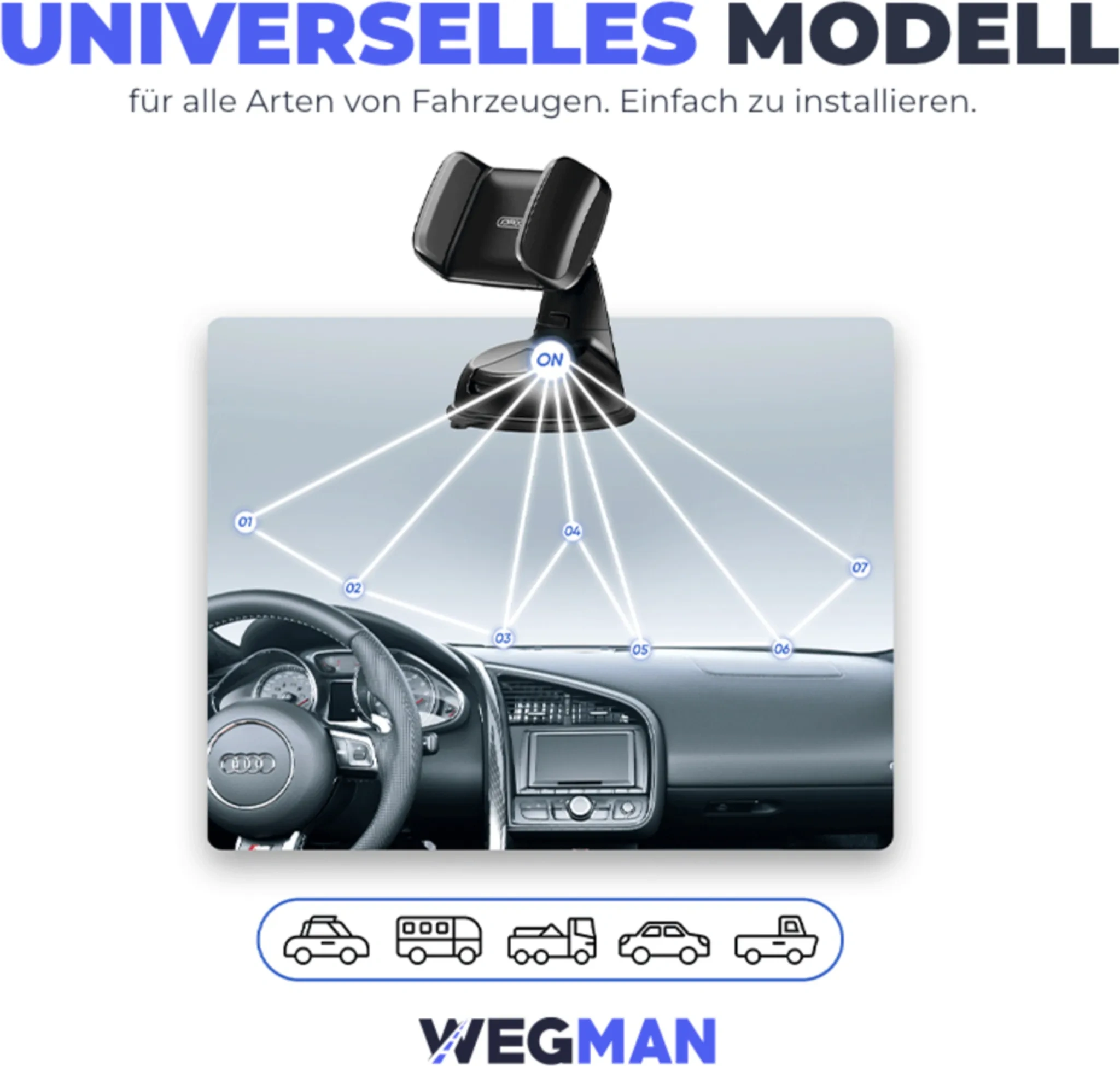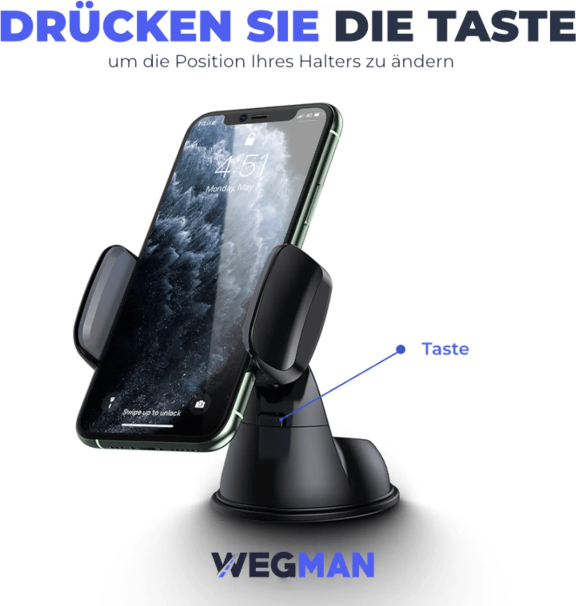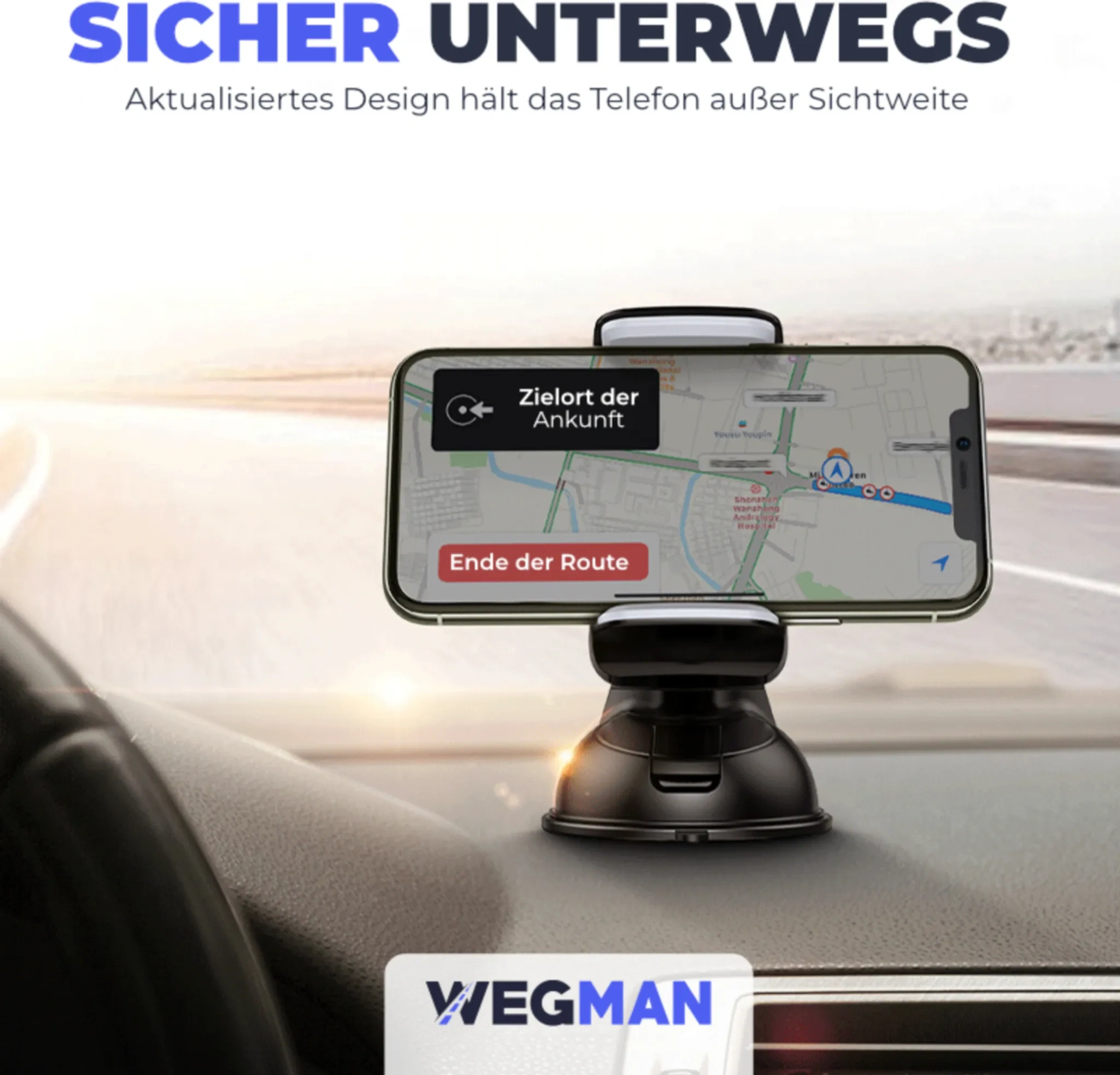 Die Wegman Universal Handyhalterung bietet Ihnen eine sichere und flexible Möglichkeit, Ihr Smartphone im Fahrzeug zu befestigen. Ob am Armaturenbrett oder an der Windschutzscheibe – der extra starke 3M-Gel-Saugnapf sorgt für festen Halt, selbst bei langen Fahrten oder hohen Temperaturen. Schluss mit wackelnden oder abfallenden Halterungen – diese Halterung bleibt, wo sie soll.